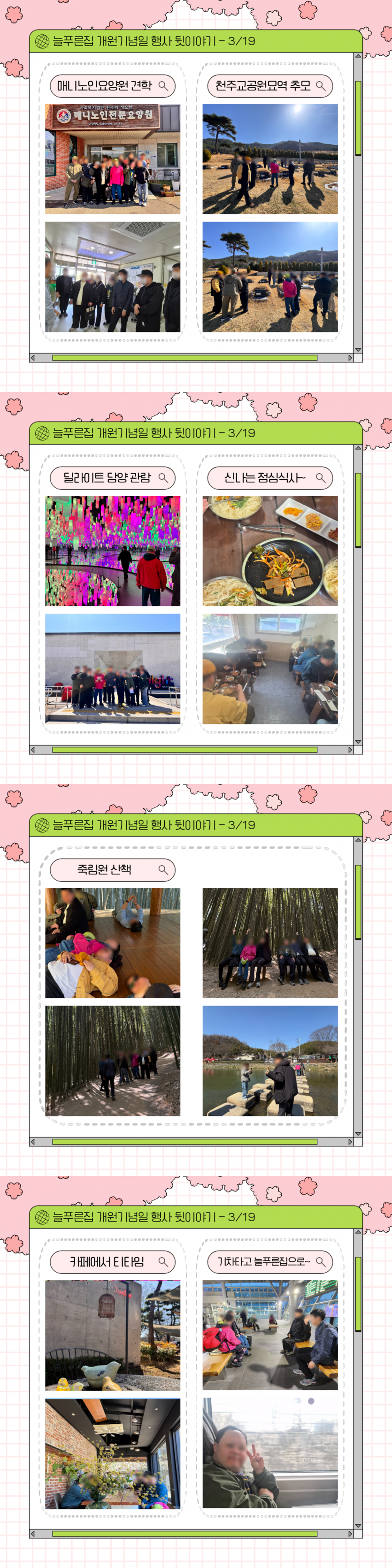 2026318()부터 319()까지 12일 동안 늘푸른집 이용인, 직원이 함께 개원기념일 행사 늘푸른집의 뿌리를 찾아서를 진행하였습니다.