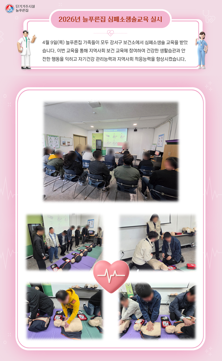 4월 9일(목) 오전 10시 늘푸른집 이용인들과 강서구 보건소에서 심폐소생술 교육에 참여하였습니다.