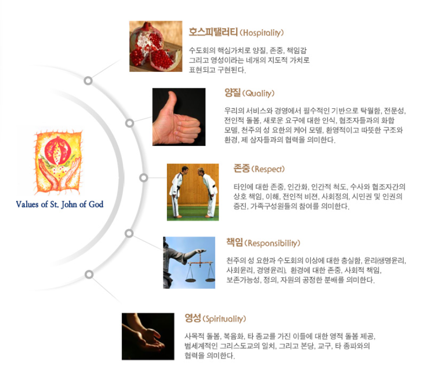 본 수도회의 영성은 천주의 성 요한(St. John of God, 1495~1550)이 삶으로 보여주었던 “호스피탤러티(Hospitality-환대정신)”을 현시 안에서 드러내며 과학의 발전으로 진보되어 가는 의료 및 건강의 관심과 기술로써 사람들을 보살피고, 특별히 “인간화(Humanization)”에 관심을 두고 헌신하는 것을 수도회의 사명임과 동시에 존재 양식으로 삼고 있습니다.